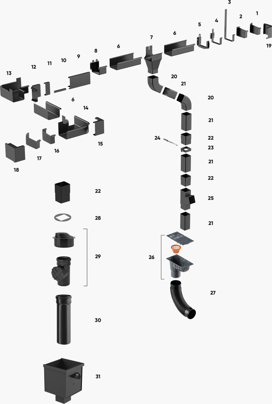 A Galeco STAL2 szögletes acél ereszcsatorna rendszer használata lehetővé teszi takarólemez alkalmazását, amelyet a csatornatartó alsó profiljába kell bepattintani, ezáltal az ereszcsatorna elülső része eltakarható, az ereszszegély alsó része pedig a dekoratív Galeco NOVA ereszaljjal fedhető be a kompakt homlokzati összkép érdekében.