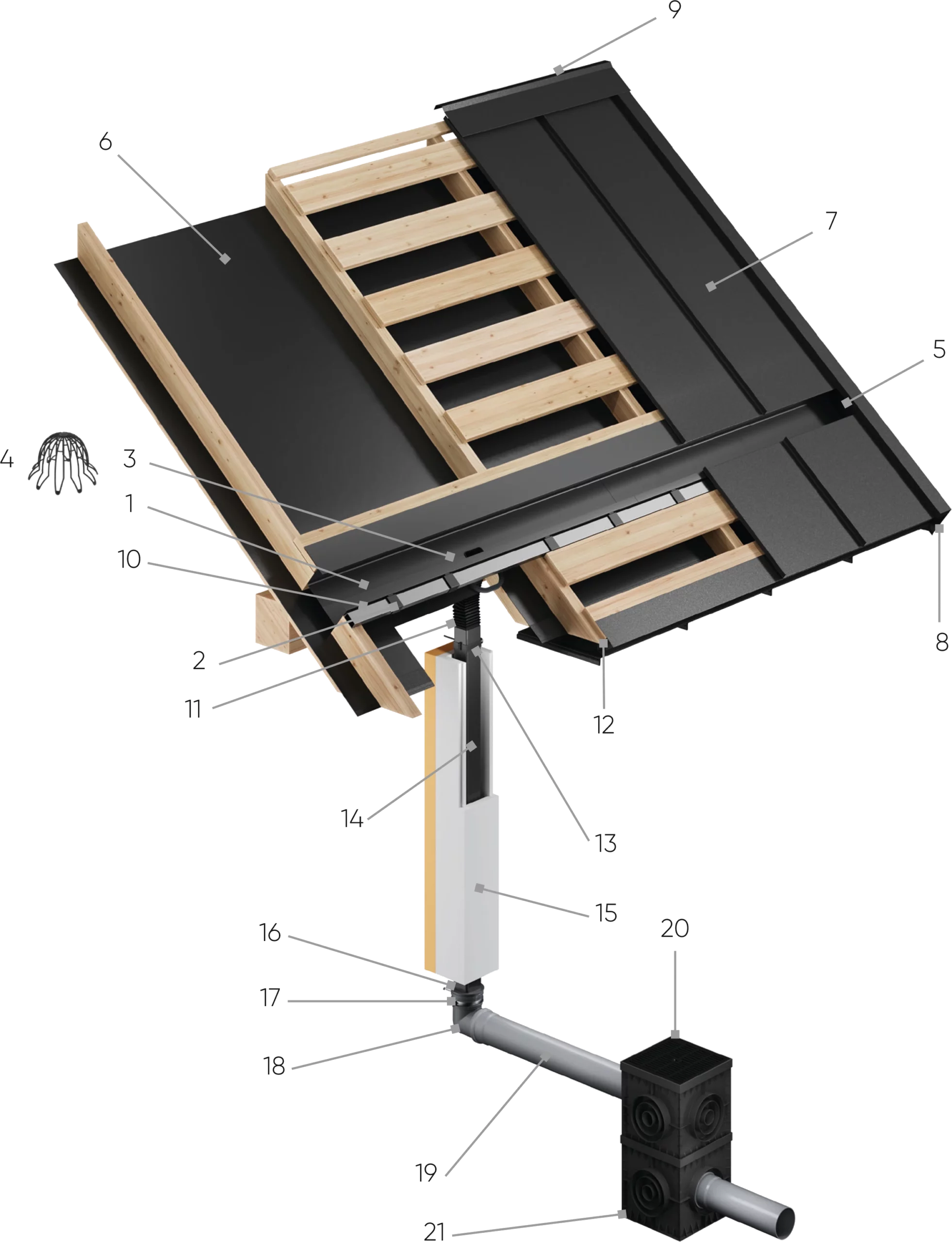 Innovatív integrált tetőrendszer, amely egy előkorcolt lemezt kombinál a szerkezetébe és az épület homlokzatába rejtett ereszcsatorna-rendszerrel. A tető és az ereszcsatorna tökéletes illeszkedése egységes és modern formát tesz lehetővé.